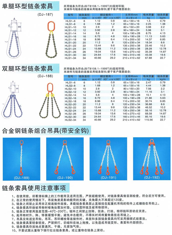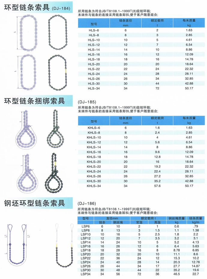 鏈條索具有:單肢鏈條索具、單肢鏈條捆綁索具、單肢環形鏈條索具、雙肢鏈條索具、雙肢鏈條捆綁索具、雙肢環形鏈條索具、三肢鏈條索具、四肢鏈條索具、環形鏈條索具、環形捆綁鏈條索具、高強度吊裝鏈條、鋼坯專用鏈條索具、可調鏈條索具等。