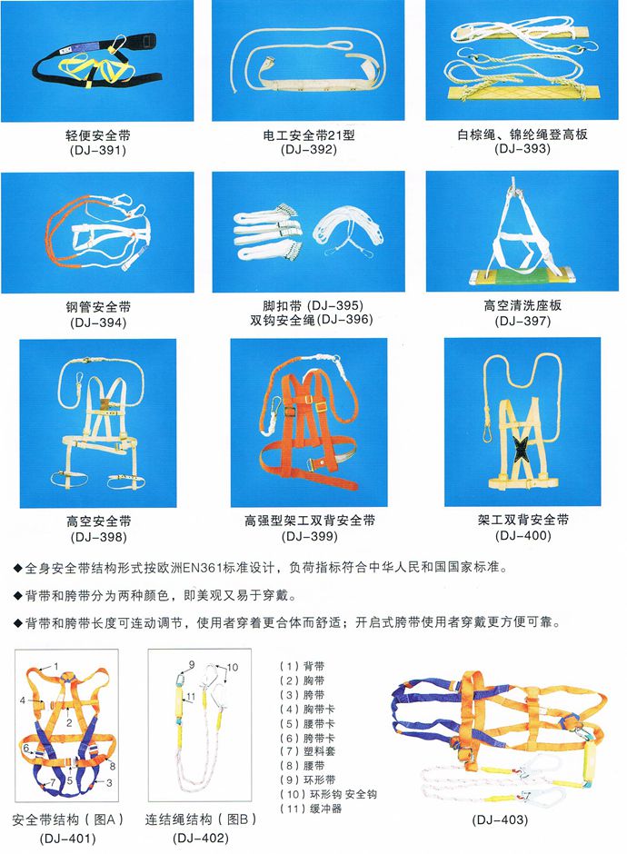 11、安全帶上的各種部件不得任意拆掉,當需要換新繩時要注意加繩套。