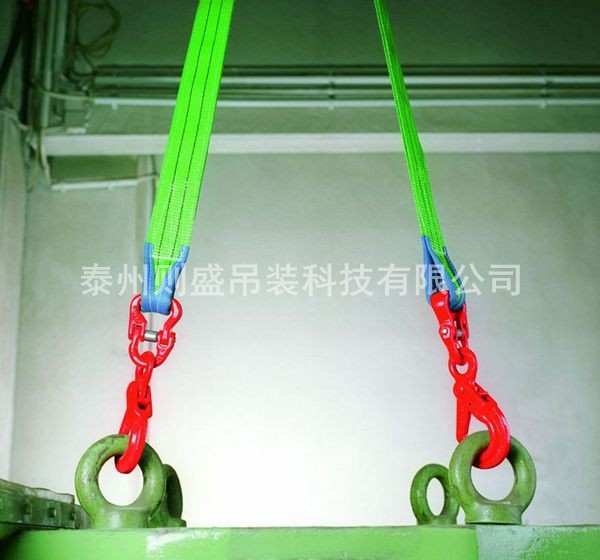 兩根吊裝帶作業時,將兩根吊裝帶直接接入雙鉤內,吊裝帶各掛在雙鉤對稱受力中心位置,四根吊裝帶使用時,每兩根吊裝帶直接掛入雙鉤內,注意內吊裝帶不能產生重疊和相互擠壓,吊裝帶要對稱于吊鉤受力中心。
