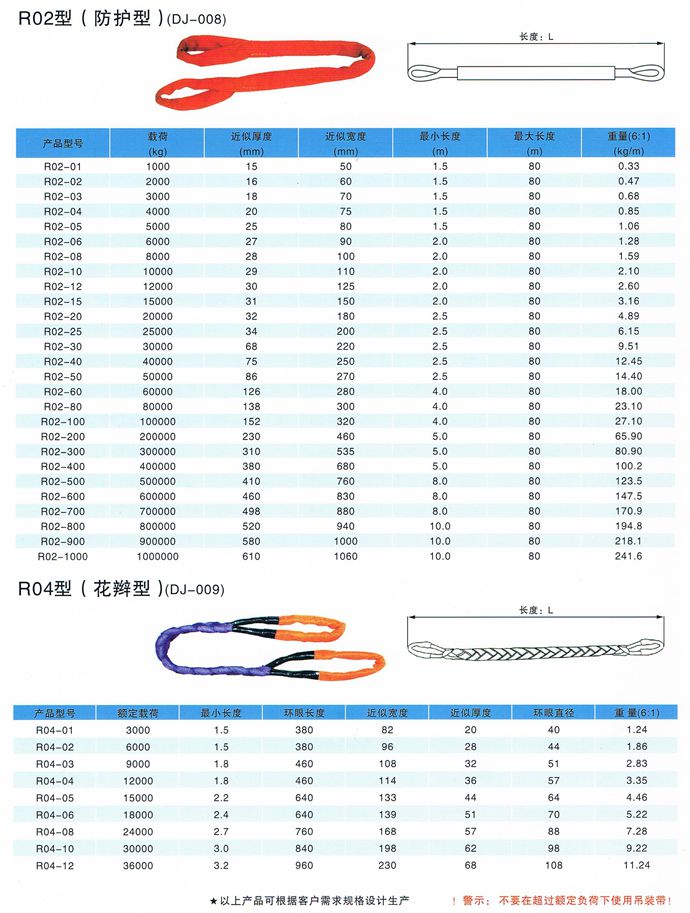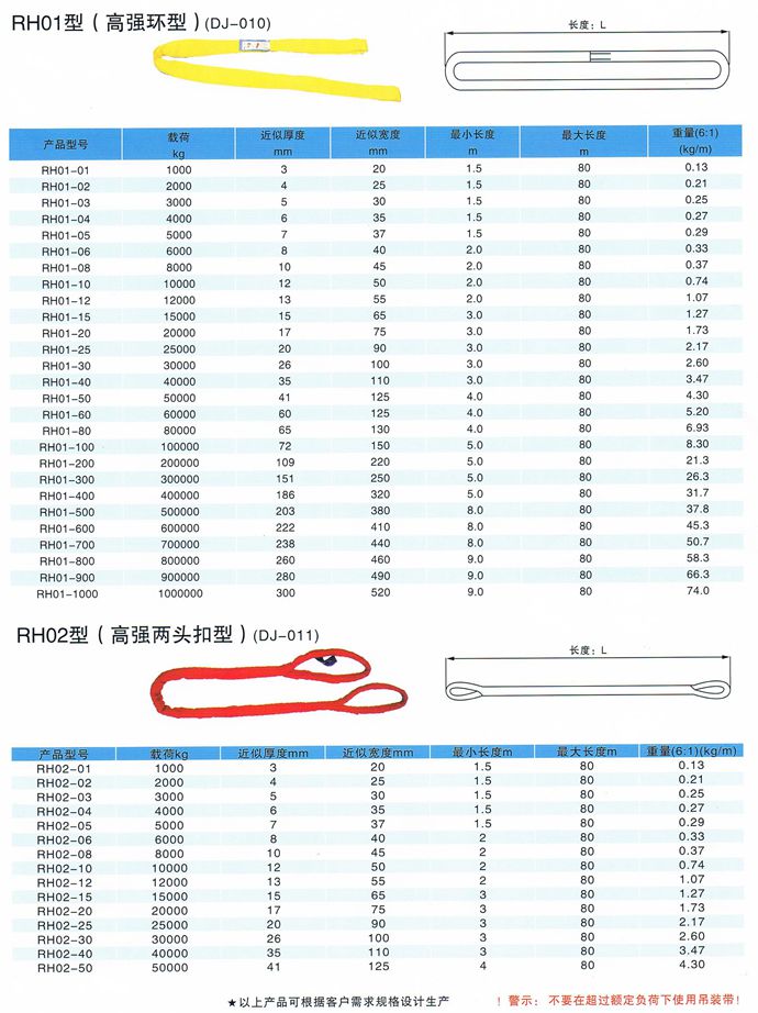 柔性吊裝帶不導電,無觸電危險,柔性吊裝帶是采用PES制成,內部承載芯采用無極環繞以構成循環狀PES織成不受力的套管對承載芯加以保護。柔性吊裝帶外表面光滑,對平滑的物體不會造成損傷,對易損物體不會造成損傷,適用于圓環形物體的吊裝,柔性吊裝帶負荷0.5-500噸,有效長度0.5-80米,符合中國行業標準JB/T8521-2007 ,柔性吊裝帶的彈性伸長較小,工作載荷下< 2%,斷裂載荷下<12% 14、使用的溫度范圍—40℃—180℃。